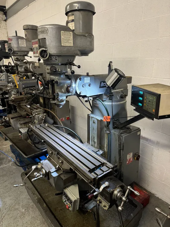 Bridgeport Turret Milling Machine, 9 x 48" Table fitted with Sevo no 2 6 inch machine vice. , 3 Axis DRO, R8 Spindle, Stand on Drip Tray and (3) x R8 Tools - Includes upgraded (New) Counter Readout to be supplied with this machine. Machine Manual, power feed in longitudinal, Coolant.