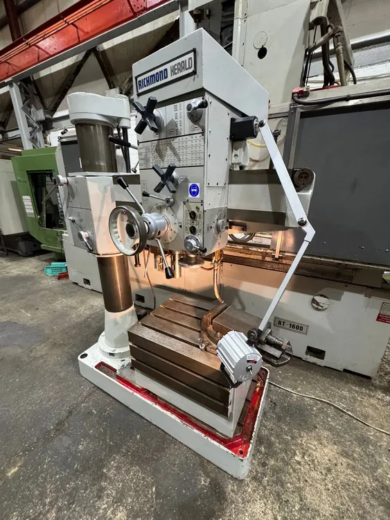 Richmond Herald Radial Arm Drill, 1 metre Arm, No 4 Morse Taper Spindle, Fitted with lovo light, 8 inch wide swivelling machine vice, Speeds 50-2000 rpm, coolant motor and pipe to spindle, safety brake with pendant, 39mm dia capacity in Cast Iron, Drill/Tap , Box Table, two sided, 700mm x 550mm x 510mm (high)