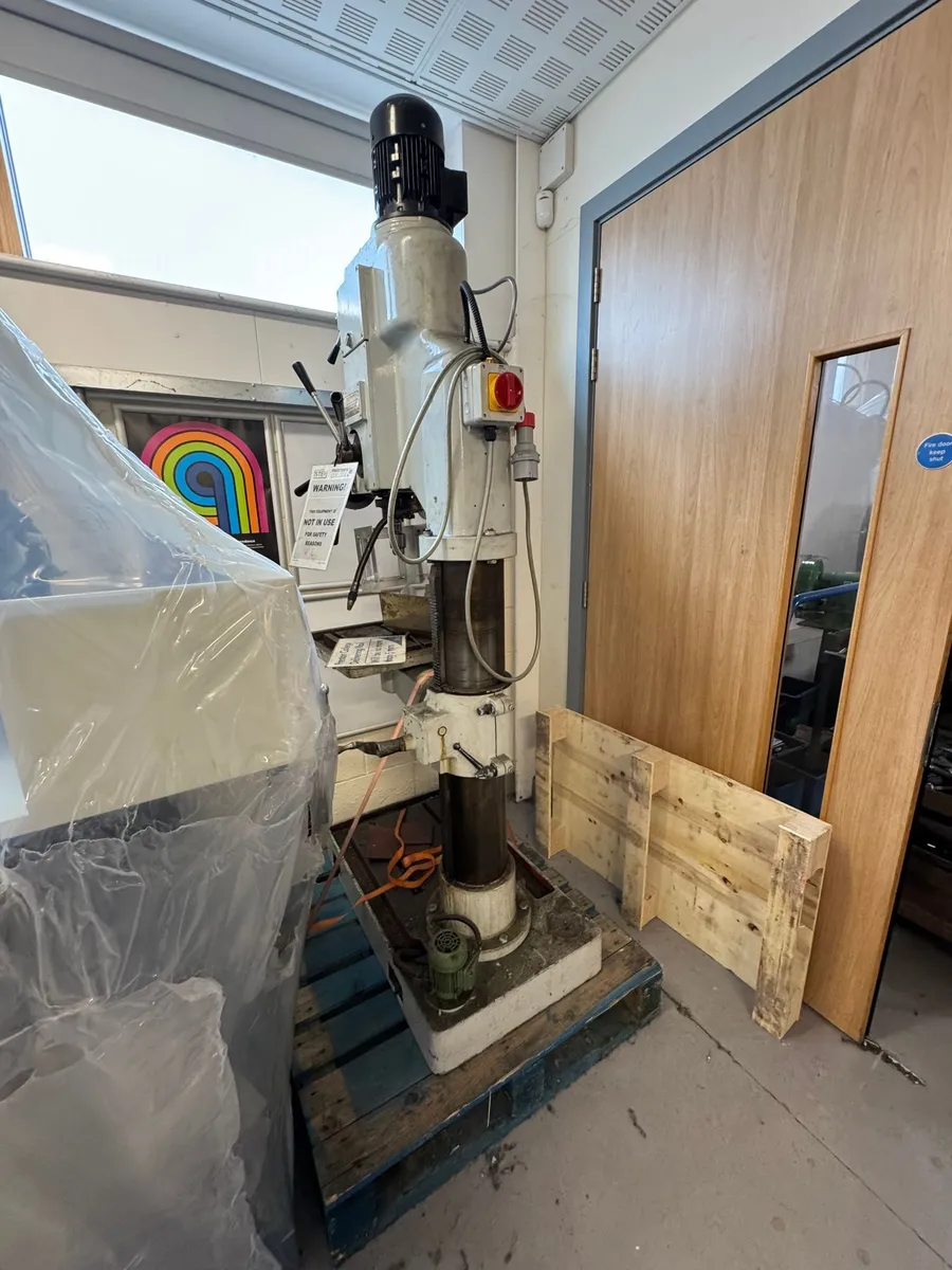 AJAX Heavy Duty Single Spindle Geared Head Pillar Drill. with swivelling tee slotted table, interlocked chuck guard, coolant, brake, lovo light.