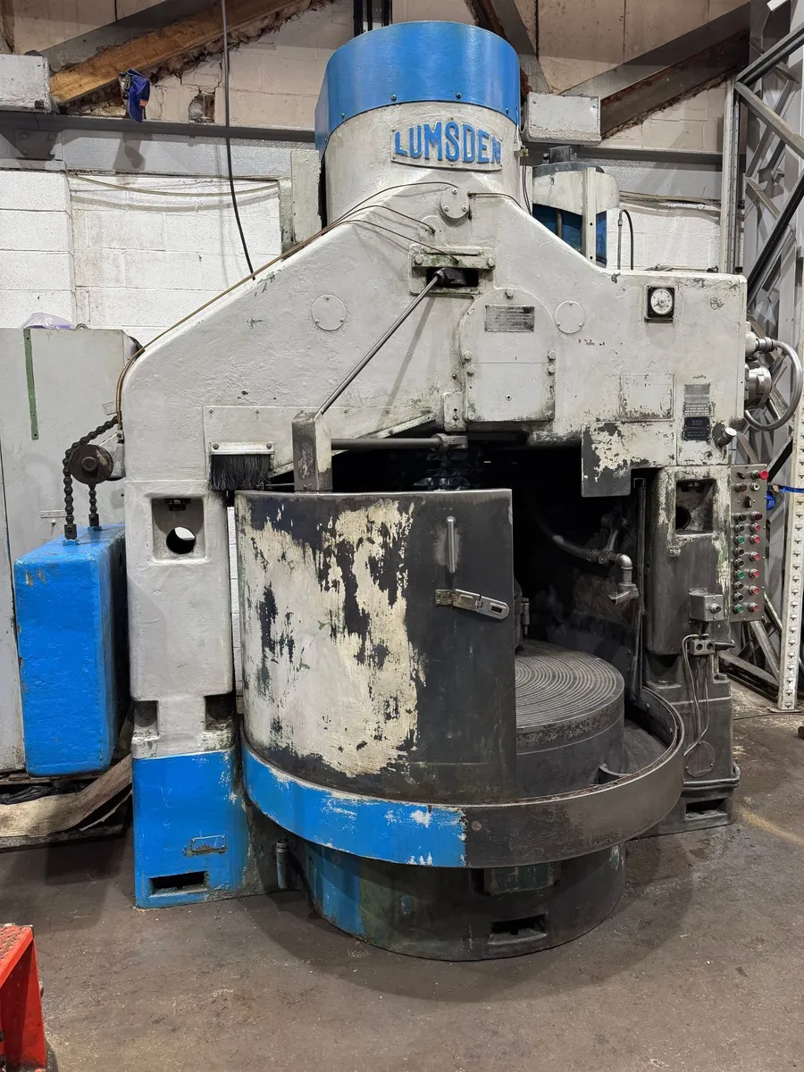 Lumsden 92 ML Vertical Spindle Rotary Surface Grinder , 48 Inch dia chuck, autosizing, table jog facility, Filtermist unit fitted with (2) extraction vents to rear of table guards, fitted with segmented wheel, serial number 92ML/109/11821. Machine tools manuals. Coolant filtration tank. Also with unused grinding stones segmented.